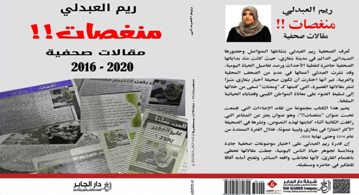 عن دار الجابر للنشر والتوزيع صدر مؤخرا كتاب”منغصات” للكاتبة الصحفية ريم العبدلي جمّعت خلاله عددا من مقالاتها الصحفية التى تحاكي الواقع الذي يعيشه المواطن الليبي وفق نشاط صاحبة الكتاب وحضورها الميداني الدائم في مدينة بنغازى كانت منذ بداياتها الصحفية حاضرة لتغطية الأحداث ورصد تفاصيل الحياة اليومية